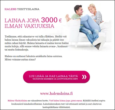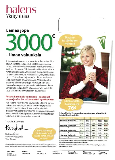 Halens Yksityislaina eroaa Halino-lainasta vain lainasummassa. Yksityislainaa oli mahdollista hakea korkeintaan 3000 euroa, mikä käy ilmi sivun oikeassa reunassa olevasta, vanhasta Halens Yksityslainan mainoksesta. Halino puolestaan myöntää sinulle jopa 5000 euroa lainaa ilman vakuuksia tai takauksia. Lisäksi Halino-lainan korko on matalampi.